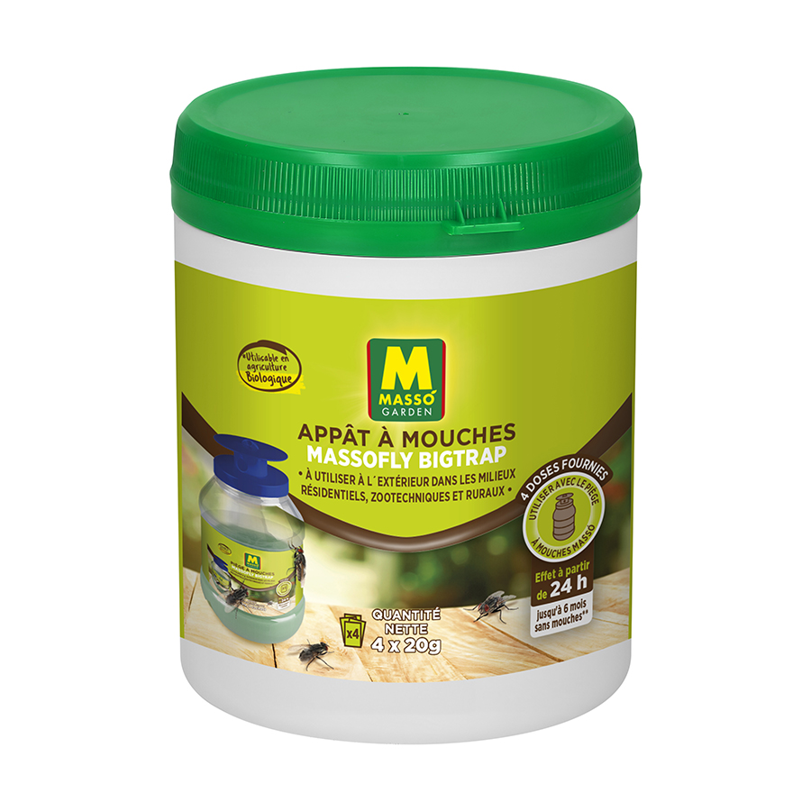 Le PIÈGE À MOUCHES MASSOFLY BIGTRAP a un grand pouvoir attractif. En utilisant l´Appât Mouches Massó Garden le produit commence son action attractive dans les 24 heures suivant. Les mouches
